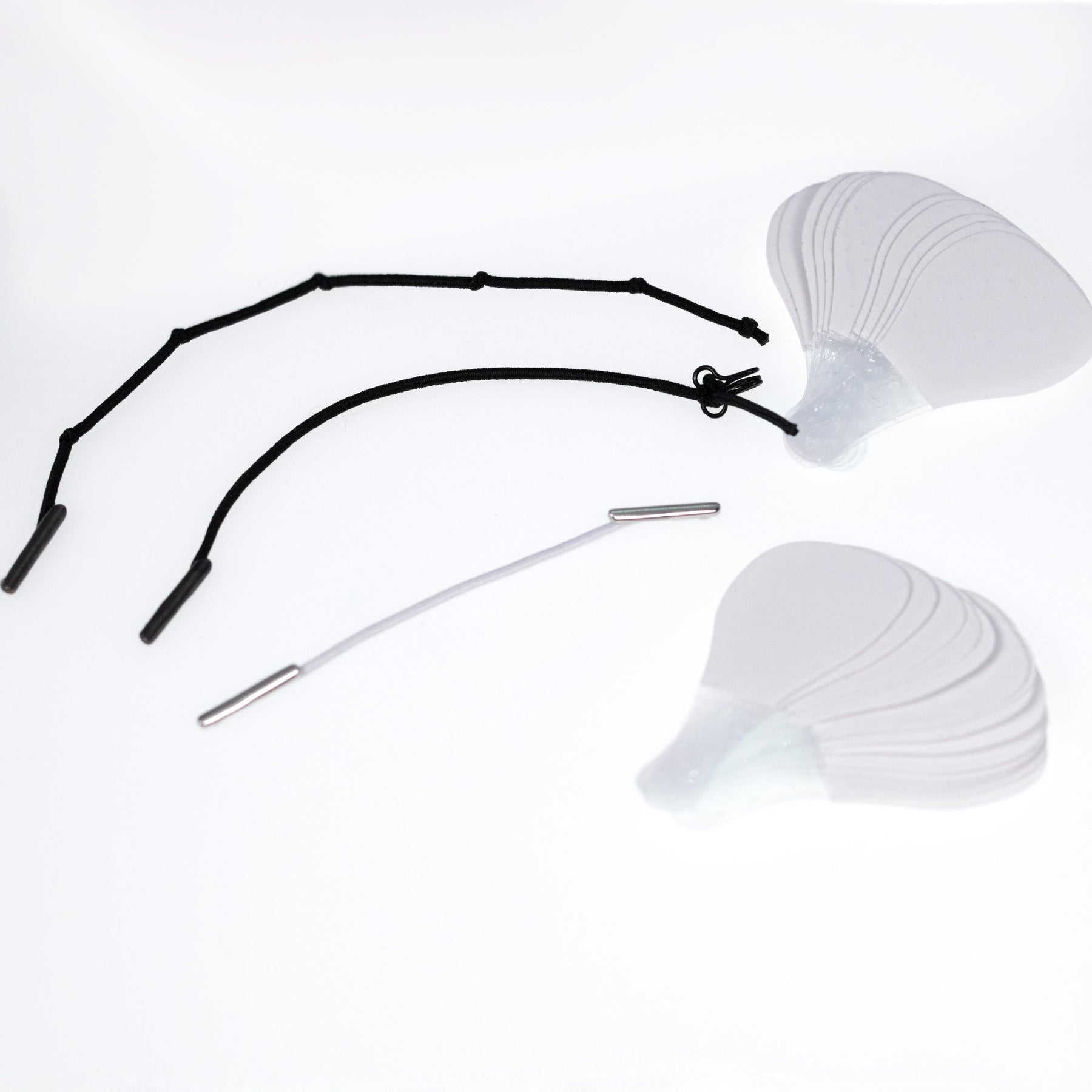 For neck and jaw lift: Take two adhesive strips and a short elastic band. Cut off the top of the adhesive strip. Insert each metal end into the hole in the adhesive strip. Remove the paper backing from the strips. Always avoid touching the adhesive area to ensure proper adhesion. Hold the elastic band with the adhesive strips, with the adhesive side facing you. Apply one adhesive strip to one side of the neck, while stretching the elastic band, bring the second adhesive strip to the other side of the neck, over the head and secure in the desired position.
